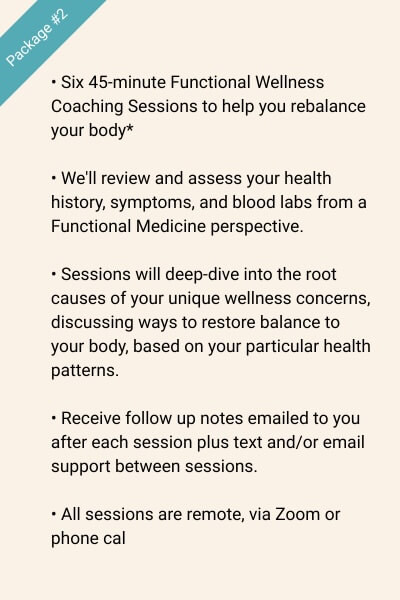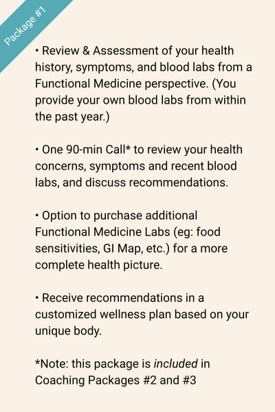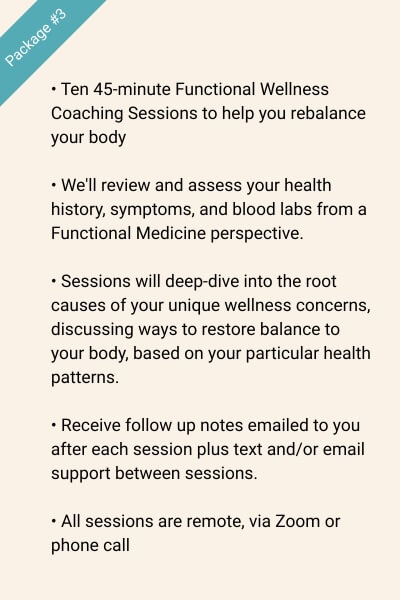 I offer three health reboot packages, in which you will receive professional guidance regarding your specific case and help you apply that knowledge to your own life- strategically, compassionately, and with the support you’ve been missing.